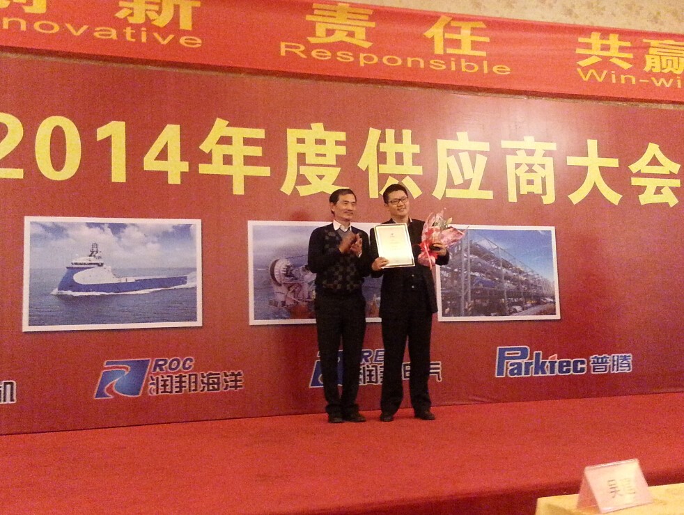 新年伊始,南通润邦海洋工程装备有限公司2014年度供应商大会在江苏南通隆重举行,来自全国各地的150家供应商二百余名代表, 润邦股份董事长、总裁及相关负责人参加了此次盛会。在当晚最受瞩目的2014年度优秀供应商颁奖环节,JIUYOU.COM九游(中国机械(上海)有限公司不负众望地获得了南通润邦海洋工程装备有限公司“2014年度优秀供应商”荣誉称号,JIUYOU.COM九游(中国船舶动力部销售总经理洪波先生代表公司接受了这份荣誉并对进一步加强双方合作和共同捕捉商业机会进行了展望。
